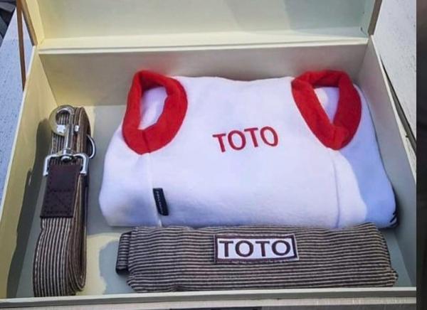 Di dalam kotak itu, ada baju kaos dengan warna dasar putih dan pinggiran warna merah. Pada bagian depan kaos terdapat tulisan "TOTO" warna merah. Sedangkan, di bagian belakangnya terdapat gambar anjing dan kucing.