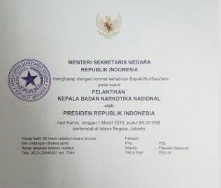 Staf Khusus Presiden Bidang Komunikasi Johan Budi membenarkan perihal pelantikan Kepala BNN besok pagi. ”Ya betul,” kata dia, Rabu (28/2/2018) malam.