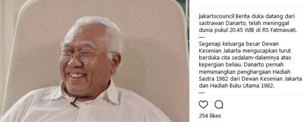 ”Segenap keluarga besar Dewan Kesenian Jakarta mengucapkan turut berduka cita sedalam-dalamnya atas kepergian beliau. Danarto pernah memenangkan penghargaan Hadiah Sastra 1982 dari Dewan Kesenian Jakarta dan Hadiah Buku Utama 1982,”ucap Dewan Kesenian Jakarta dalam akun instagram mereka, Selasa (10/4/2018) malam.