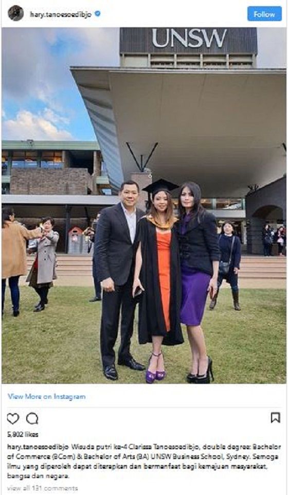 "Wisuda putri ke-4 Clarissa Tanoesoedibjo, double degree: Bachelor of Commerce (BCom) and Bachelor of Arts (BA) UNSW Business School, Sydney," tulis HT, yang diunggah di akun Instagramnya @Hary.Tanoesoedibjo, Sabtu (16/6/2018).