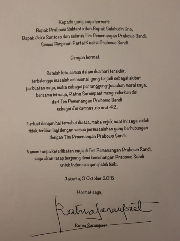 JAKARTA, iNews.id – Ratna Sarumpaet sore tadi telah mengakui kebohongannya tentang cerita penganiayaan yang dia alami. Kini, beredar sepucuk surat pengunduran diri Ratna sebagai juru kampanye dalam Badan Pemenangan Nasional (BPN) Prabowo Subianto–Sandiaga Salahuddin Uno di Pilpres 2019.
