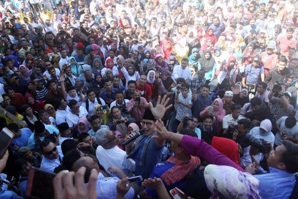 Calon wakil presiden Republik Indonesia no urut 02, Sandiaga Salahuddin Uno, mengangkat tangannya saat berkunjung ke Pasar Raya Inpres II, Padang, Sumatera Barat, Jumat (19/18/2018). (Foto: ANTARA/Muhammad Arif Pribadi)