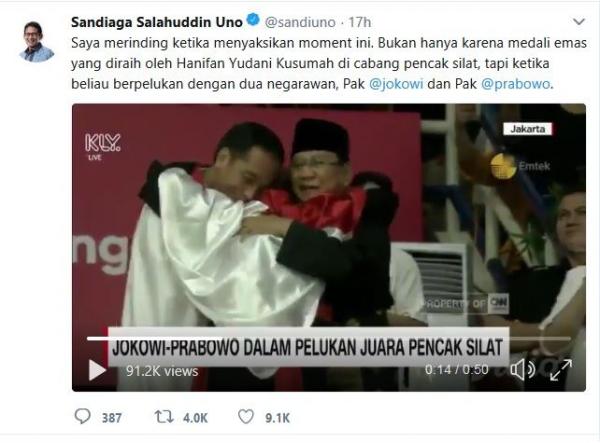 “Saya merinding ketika menyaksikan momen ini. Bukan hanya karena medali emas yang diraih oleh Hanifan Yudani Kusumah di cabang pencak silat, tapi ketika beliau berpelukan dengan dua negarawan, Pak Jokowi dan Pak Prabowo,” ungkap Sandiaga melalui akun Twitter miliknya @sandiuno, Rabu (29/8/2018) malam.
