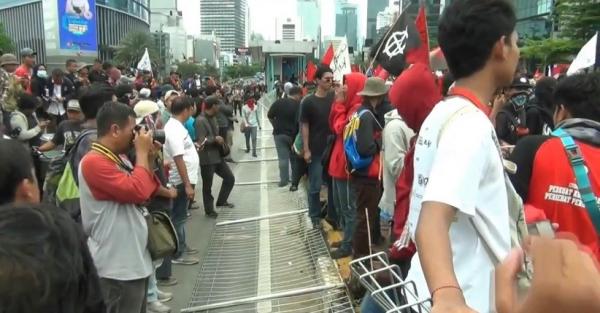 Berdasarkan pantauan, gerombolan pemuda berpakaian serbahitam tampak berlarian saat massa buruh terlibat kericuhan dengan aparat kepolisian di kawasan Tosari, Jalan Thamrin, Jakarta Pusat. Mereka tampak mencopot paksa dan menginjak-injak pagar pembatas jalur bus Transjakarta (busway) di lokasi itu.