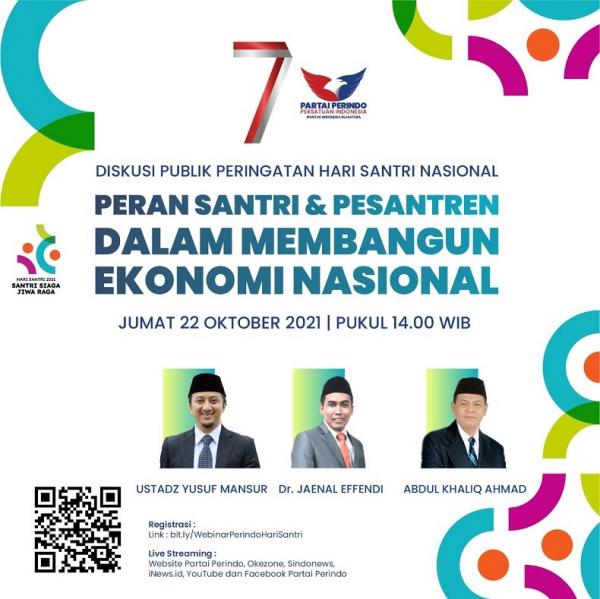 Dalam rangka memperingati Hari Santri Nasional 2021, Partai Perindo menggelar diskusi publik secara virtual dalam rangka memperingati Hari Santri Nasional 2021, hari ini, Jumat (22/10/2021) pukul 14.00.