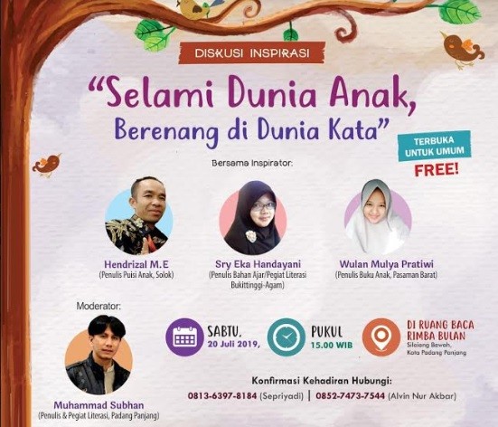 Diskusi Inspirasi itu sendiri bertajuk “Selami Dunia Anak Berenang di Dunia Kata”. Ketiga narasumber, papar Sepriadi, masing-masing akan berbicara kiat menulis buku anak, baik cerpen, dongeng, maupun puisi serta cara mengelola komunitas literasi berbasis anak-anak.
