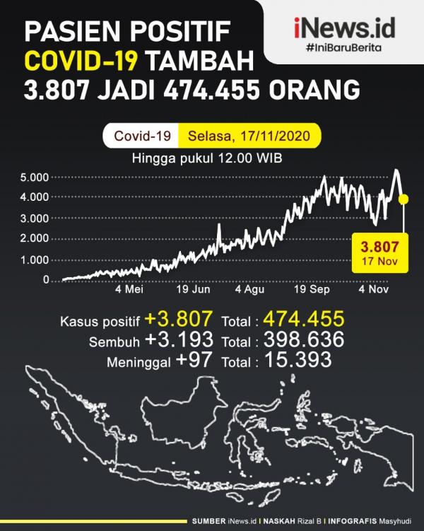 JAKARTA, iNews.id - Pasien positif covid-19 bertambah 3.807 orang hari ini, Selasa (17/11/2020). Total kasus positif covid-19 di Indonesia kini menjadi 474.455 orang.