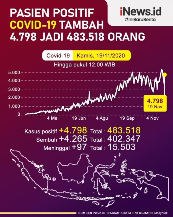 JAKARTA, iNews.id - Pemerintah kembali memutakhirkan data kasus terkonfirmasi positif virus corona (Covid-19) di Indonesia. Jumlah pasien positif Covid-19 mencapai 483.518 orang, Kamis (19/11/2020).
