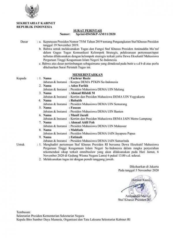 JAKARTA, iNews.id - Viral surat undangan Staf Khusus (Stafsus) Presiden Aminuddin Ma'ruf, yang mengundang mahasiswa untuk diskusi Undang-Undang (UU) Cipta Kerja atau Omnibus Law. Surat tersebut menjadi sorotan karena berjudul 'Surat Perintah'.