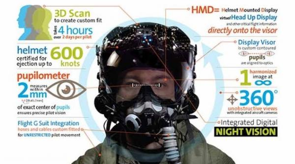 Berikutnya ada Helm F35. Helm ini digunakan khusus untuk pilot yang biasa menerbangkan pesawat jet tempur F35. Ada banyak fitur yang terdapat dalam helm ini, antara lain mode kunci target musuh, night vision, hingga picture in picture.