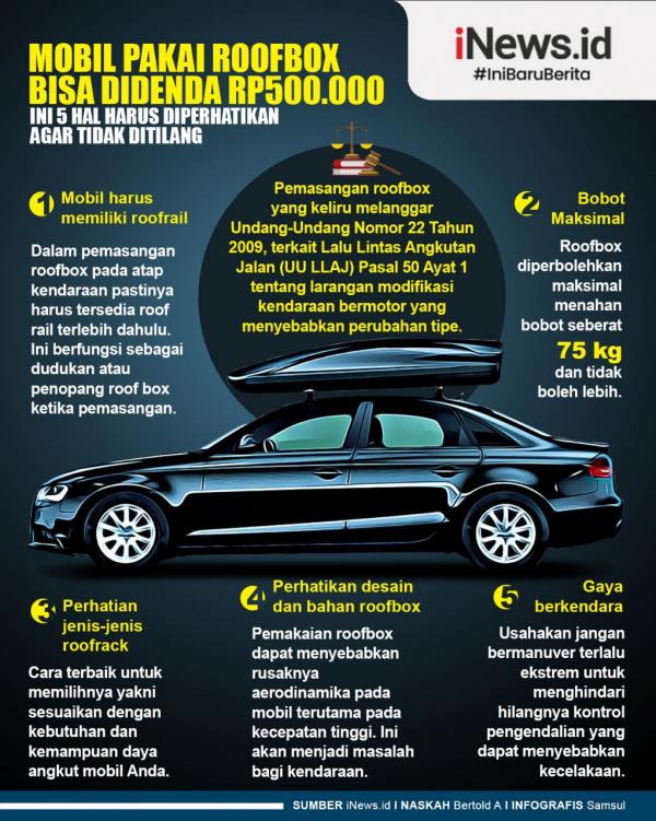 JAKARTA, iNews.id - Pemasangan kompartemen tambahan boks di atap mobil (roofbox) menjadi hal biasa terutama bagi yang suka bepergian ke luar kota membawa banyak barang atau mereka yang suka berpetualang. Namun, tahukah Anda memasang roofbox tidak sesuai dengan aturan bisa ditilang.