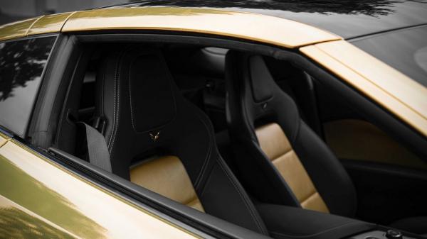 Itu termasuk kaliper rem merah dan elemen aerodinamis hitam termasuk ventilasi fender, splitter depan, sayap belakang dan diffuser belakang. Tema emas berlanjut di dalam, dengan aksen pada kursi dan panel pintu.