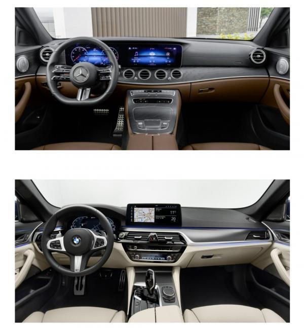 Di bagian interior, E-Class dilengkapi roda kemudi generasi baru. 5-Series lebih banyak tombol daripada E-Class dan mempertahankan model audio stereo.
