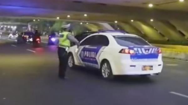 Sebelum mobil polisi tersebut merangsek ke barisan rombongan, polisi di tepi jalan sudah lebih dulu menghentikan satu mobil sipil yang juga keluar dari belokan yang sama.
