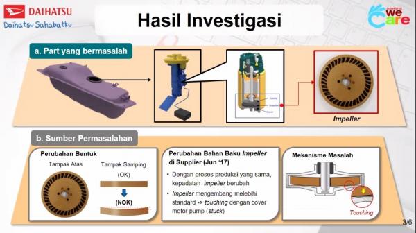 Executive Coordinator Technical Service Division PT ADM, Bambang Supriyadi mengungkapkan, berdasarkan investigasi ditemukan kerusakan pada fuel pump. Jika dibiarkan berpotensi mobil mati dan sulit dihidupkan.