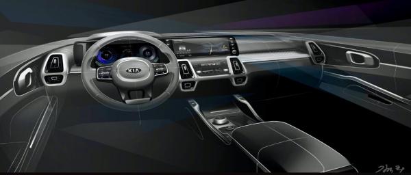 Kia menggambarkan fasia tengah sebagai "teknis dan sangat fokus" yang memberikan pengalaman intuitif secara visual dan kontrol teknologi canggih." Sketsa juga mengungkap rotary shifter untuk transmisi otomatis yang terletak di antara dua kursi depan.