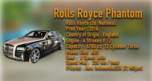 Sementara spesifikasi mobil Rolls-Royce Phantom milik Raffi Ahmad merupakan Ghost Series I AT, keluaran 2011 yang dibanderol Rp2,565 miliar. Sementara untuk pajak kendaraannya sebesar Rp65 jutaan.