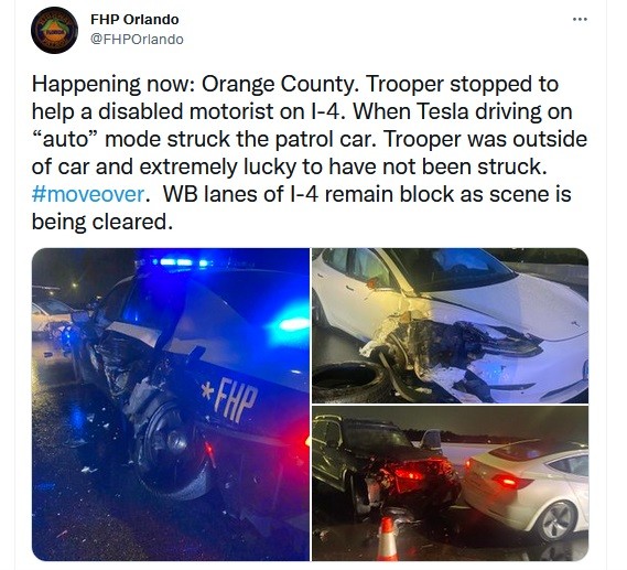 Melalui media sosial, Florida Highway Patrol divisi Orlando mengungkapkan kejadian saat mobil polisi Dodge Charger berhenti di pinggir jalan untuk membantu SUV Mercedes-Benz. Tiba-tiba, Tesla Model 3 menyeruduk kedua kendaraan tersebut, menabrak sisi kiri mobil polisi dan bagian depan SUV.