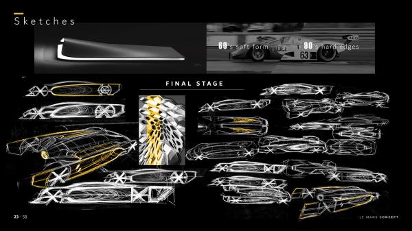 Di belakang, ada turbin besar (atau mungkin kipas untuk menghasilkan downforce), lampu LED vertikal pada dua sirip belakang dan komponen suspensi terbuka. Aksen emas di bagian atas konsep melengkapi penampilan yang mencolok.