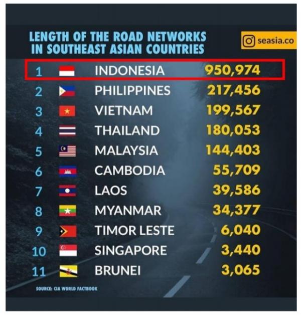 Berdasarkan data, Indonesia juga memiliki jalan terpanjang di kawasan ASEAN, yakni 950.974 km. Sementara Filipina hanya 217.456 km, Vietnam 199.567 km, dan Thailand 180.053 km. "Tentu ini membutuhkan alat transportasi untuk mobilitas masyarakat," katanya.