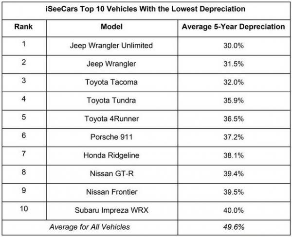 Jeep Wrangler dan Wrangler Unlimited menduduki daftar pucak penyusutan terbaik, yakni 31,5 persen dan 30,0 persen dari nilainya dalam lima tahun.