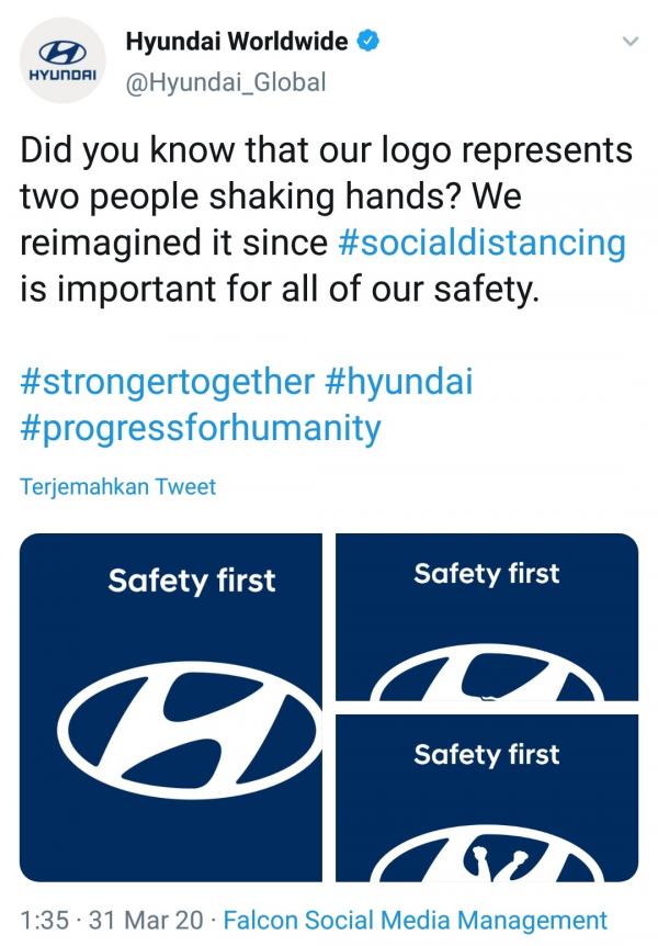 Dikutip dari Twitter resminya, Selasa (7/4/2020), dalam cuitan terbaru Hyundai tampak memodifikasi logo menggambarkan salaman menggunakan sikut. Di mana logo Hyundai merupakan perwujudan dari dua orang bersalaman jabat tangan.