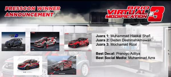 “Kompetisi modifikasi virtual yang memasuki tahun ketiga ini mendapatkan antusiasme sangat baik dari masyarakat khususnya di kalangan modifikator. Tidak hanya jumlahnya yang meningkat di setiap tahun, namun juga kualitas desain dari para peserta terlihat semakin baik. Kami berharap kompetisi ini semakin populer dan dapat digunakan sebagai wadah bagi para modifikator berbakat untuk menyalurkan kreativitasnya,” kata Business Innovation and Sales - Marketing Director PT Honda Prospect Motor Yusak Billy.
