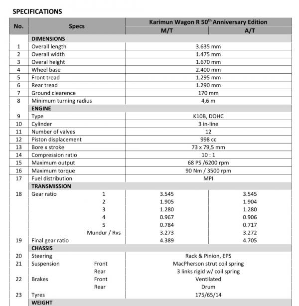 Karimun Wagon R 50th Anniversary Edition diproduksi dengan dua pilihan transmisi yang terdiri dari 30 unit transmisi manual dan 20 unit transmisi otomatis. Selain itu, mobil ini hanya tersedia dalam satu pilihan warna, yaitu Pearl White Metalic.