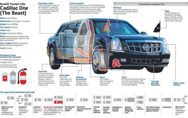 The Beast sengaja dirancang untuk menghadapi segala risiko terburuk yang dapat terjadi pada Donald Trump. Selain tahan peluru, limosin tersebut juga mampu menahan ledakan, serta serangan kimia dan senjata biologis.