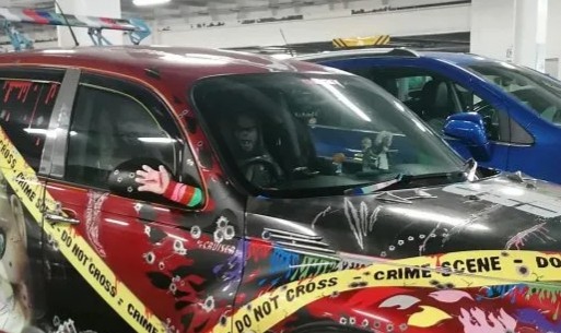 Anda juga dapat melihat tangan ditempelkan di kaca spion dan sarung jok khusus, lengkap dengan Chucky di sandaran kepala. Pemiliknya juga telah melengkapi mobil dengan sayap belakang aftermarket.