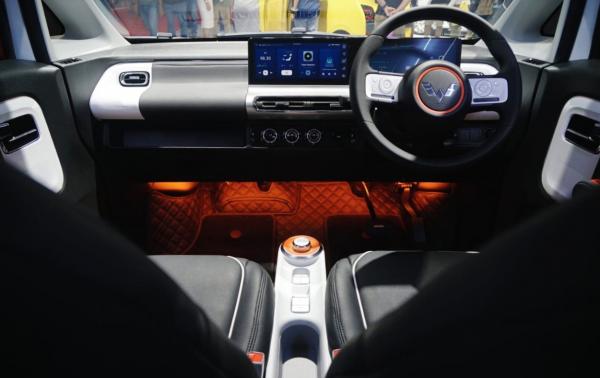 Bagian interior hitam dan oranye dengan aksen emboss karbon putih berbahan sintetis. Kemudian, pada bagian dashboard di sisi penumpang dihiasi kulit microfiber berwarna hitam. Terdapat pula LED oranye sebagai ambient light di bawah dashboard dan di dalam kompartemen pintu. Wuling juga menambahkan aksen airbrush berwarna silver dan oranye di bagian interior.