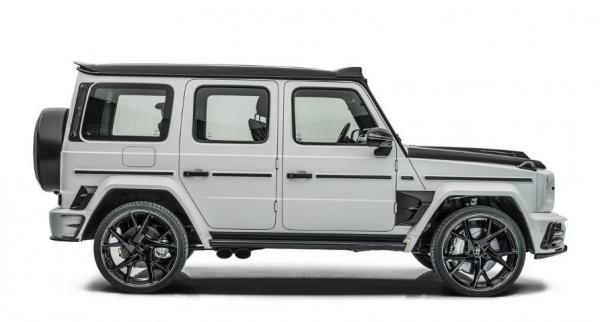 Perubahan berlanjut di sisi G-Class, termasuk ventilasi serat karbon baru di belakang roda depan, pipa knalpot berujung hitam, dan satu set roda hitam yang unik.
