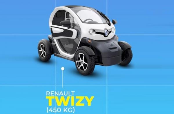 Mobil bertenaga listrik ini hanya memiliki bobot sebesar 450 kg. Panjangnya hanya 2,3 meter dan 1,4 meter, mobil ini cukup laris di Eropa pada 2012. Renault Twizy memiliki desain yang unik satu pengemudi di depan dan satu penumpang di belakang, layaknya sebuah sepeda motor.