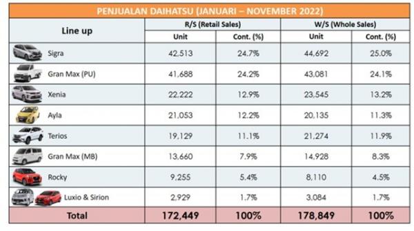 Secara volume dan kontribusi model, penjualan ritel Daihatsu hingga November 2022 tetap didominasi oleh top 3 model, seperti Sigra sebanyak 42.513 unit, atau berkontribusi sekitar 24,7 persen; disusul Gran Max PU (Pick Up) sebanyak 41.688 unit (24.2 persen); dan Xenia dengan raihan 22.222 unit (12,9 persen).