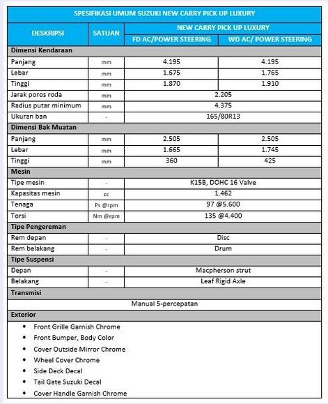Berapa harga mobil ini? Carry Luxury tipe Flat Deck AC/PS dibanderol Rp155,1 juta dan tipe Wide Deck AC/PS Rp156,1 juta on the road (OTR) Jakarta.