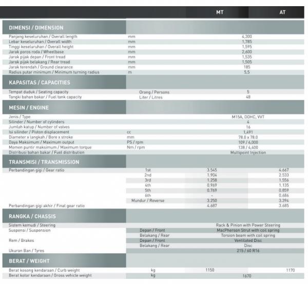 Menggendong mesin berkapasitas 1.491cc VVT DOHC M15A, mobil ini mampu menghemburkan tenaga maksimum 109ps/6.000 rpm dan torsi 138 Nm/4.400 rm. Untuk pilihan transmisi, yakni varian automatic (AT) dengan enam percepatan dan manual lima percepatan.