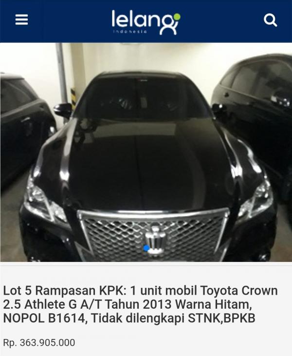 JAKARTA, iNews.id - Salah satu sedan mewah hasil sitaan korupsi masuk daftar lelang. Menariknya, Toyota Crown 2.5 Athlete G A/T tahun 2013 tersebut dibanderol cukup murah dari harga aslinya.