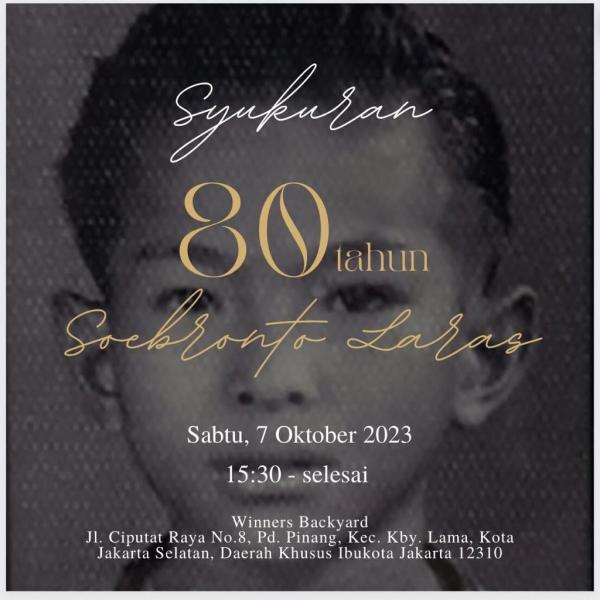 Dari informasi yang dihimpun, Soebronto Laras akan memasuki usia 80 tahun. Acara syukuran pun telah disiapkan pihak keluarga yang rencananya akan diadakan 7 Oktober 2023 di Winners Backyard, Jl Ciputat Raya No 8 Pondok Pinang, Kebayoran Lama, Jakarta Selatan.