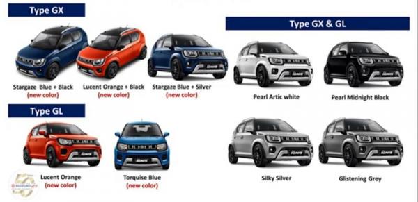 New Ignis hadir dalan dua tipe, yaitu GL dan GX dengan pilihan transmisi manual 5-percepatan dan Auto Gear Shift (AGS). Selain itu, Ignis terbaru tersedia dalam sembilan pilihan warna, yakni Pearl Arctic White, Metallic Silky Silver, Metallic Glistening Gray, Metallic Lucent Orange, Pearl Midnight Black, Torquise Blue, Stargaze Blue with Black Roof, Stargaze Blue with Silver Roof, Lucent Orange with Black Roof.