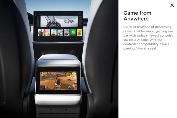 Tesla mengatakan dua layar tengah baru dari Model S dan Model X yang diperbarui memiliki fitur komputer game dengan daya pemrosesan "hingga 10 teraflop", hampir sama dengan konsol game generasi terbaru, yang memungkinkannya menjalankan game seperti "The Witcher 3" dan "Cyberpunk", selain game arcade yang sudah tersedia melalui pengontrol nirkabel.