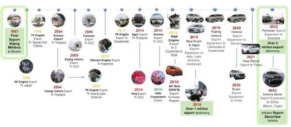 Secara keseluruhan, Gabungan Industri Kendaraan Bermotor Indonesia (Gaikindo) mencatat kinerja ekspor Indonesia sepanjang Januari-September 2023 sebanyak 213.901 unit. Pencapaian ini naik 2,5 persen dibandingkan ekspor pada 2022 sebanyak 208.775 unit. Sementara itu, kinerja ekspor CBU sebanyak 379.498 unit pad periode Januari-September 2023. Toyota Indonesia menyumbang 56 persen pencapaian ekspor dari kendaraan bermerek Toyota, yang termasuk di dalamnya HEV Kijang Innova Zenix dan Yaris Cross.