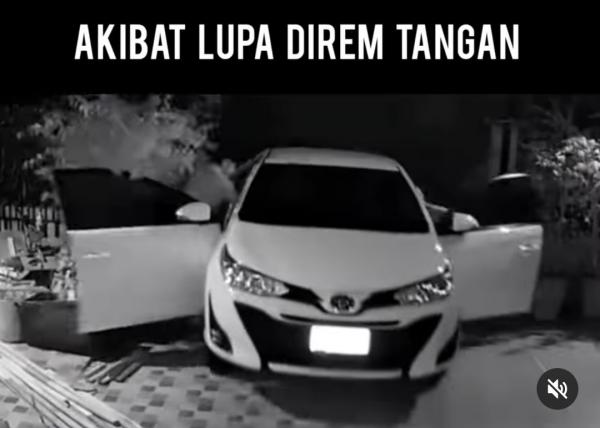 Seperti yang dialami pemilik mobil Yaris putih ini. Mereka lupa menarik rem tangan saat keluar dari mobil di garasi rumah