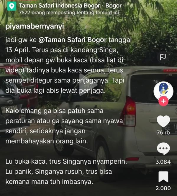 Sang pengunggah video pun mengungkapkan kekesalannya. Jika tidak mau mematuhi aturan dan teguran petugas setidaknya jangan membahayakan orang lain. "Lu buka kaca terus singanya nyamperin, lu panik singa rusuh, terus bisa kemana-mana tuh imbasnya," tulis sang pemilik akun.
