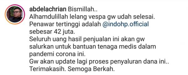Dalam lelang yang ditutup pukul 13.00 WIB ini skuter Vespa Abdel terjual Rp42 juta. "Seluruh uang hasil penjualan ini akan gw salurkan untuk bantuan tenaga medis dalam pandemi corona ini," tulisnya.