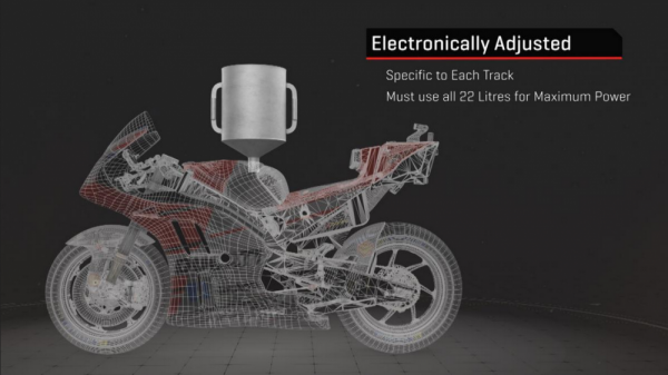 Lantas, apa isi cover tangki bahan bakar pada motor MotoGP? Setiap tim memanfaatkan ruang kosong tersebut untuk menempatkan berbagai perangkat elektronik. Seperti diketahui, saat ini motor MotoGP sebagian besar dijalankan dengan perangkat elektronik.
