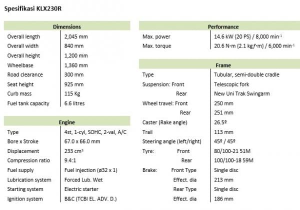 KLX230R dilengkapi mesin berkapasitas 233 cm3 berpendingin udara, single engine 4-tak yang menghasilkan torsi rentang menengah ke bawah yang pas, dan konstruksi cocok untuk melewati rintangan berat. All-new perimeter frame pada motor ini memberikan kestabilan handling, ditambah ground clearance dan long-travel suspension yang superior meningkatkan performa off road.