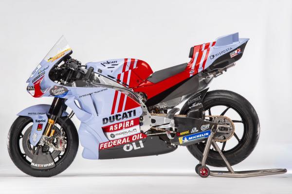 Livery motor Ducati Desmosedici pada musim balap 2023 masih mempertahankan warna biru muda dengan kombinasi merah mencolok mewakili Federal Oil, serta sentuhan garis tegas modern.