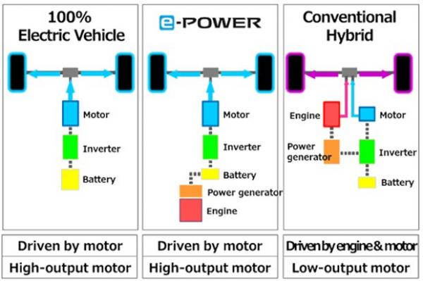 Dalam sistem hybrid konvensional, motor listrik dengan output rendah digabungkan dengan mesin bensin untuk menggerakkan roda saat kondisi baterai sedang lemah (atau saat bepergian dengan kecepatan tinggi). Namun, dalam sistem e-Power, mesin bertenaga bensin tidak terhubung ke roda; hanya untuk mengisi baterai saja.