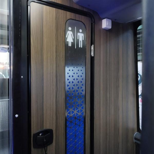 Bagian ini justru dibuat dengna sangat elegan. Perpaduan kayu dan kaca yang telah dikamuflase dengan corak khusus membuat toilet terlihat semakin elegan. Jauh dari kesan seadanya seperti toilet-toilet yang ada di bus-bus antar kota.