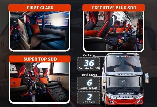 Selama 2021, Rosalia Indah memiliki 21 armada bus double decker yang melayani berbagai rute antar provinsi di Pulau Jawa. Sebagai armada dengan kualifikasi tertinggi, double decker hadir dalam tiga kelas di setiap unitnya. Di lantai I, tersedia dua seat kelas First Class, dan enam seat kelas Super Top.